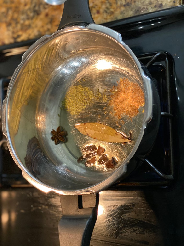 As the oil heats up, add all the dry spices (cinnamon, cumin seeds, fennel seeds, star anise, bay leaf )