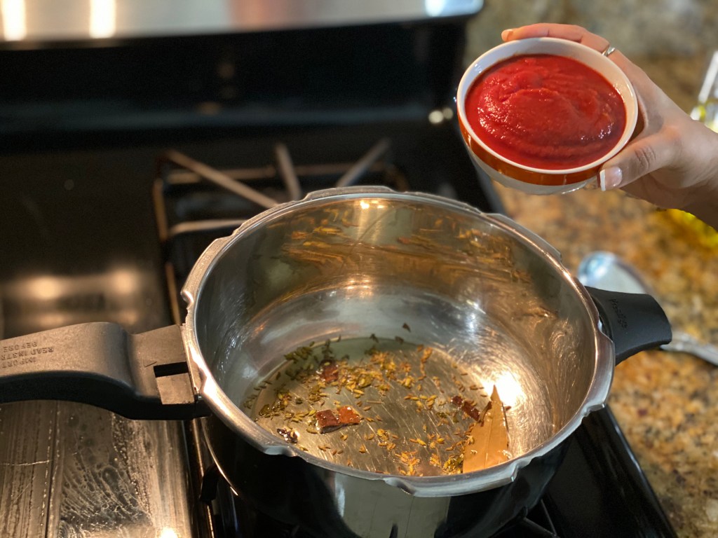 As the spices start splattering, add kasuri methi. As the methi starts to cook, you can smell the aroma of methi. Now, add the tomato puree.