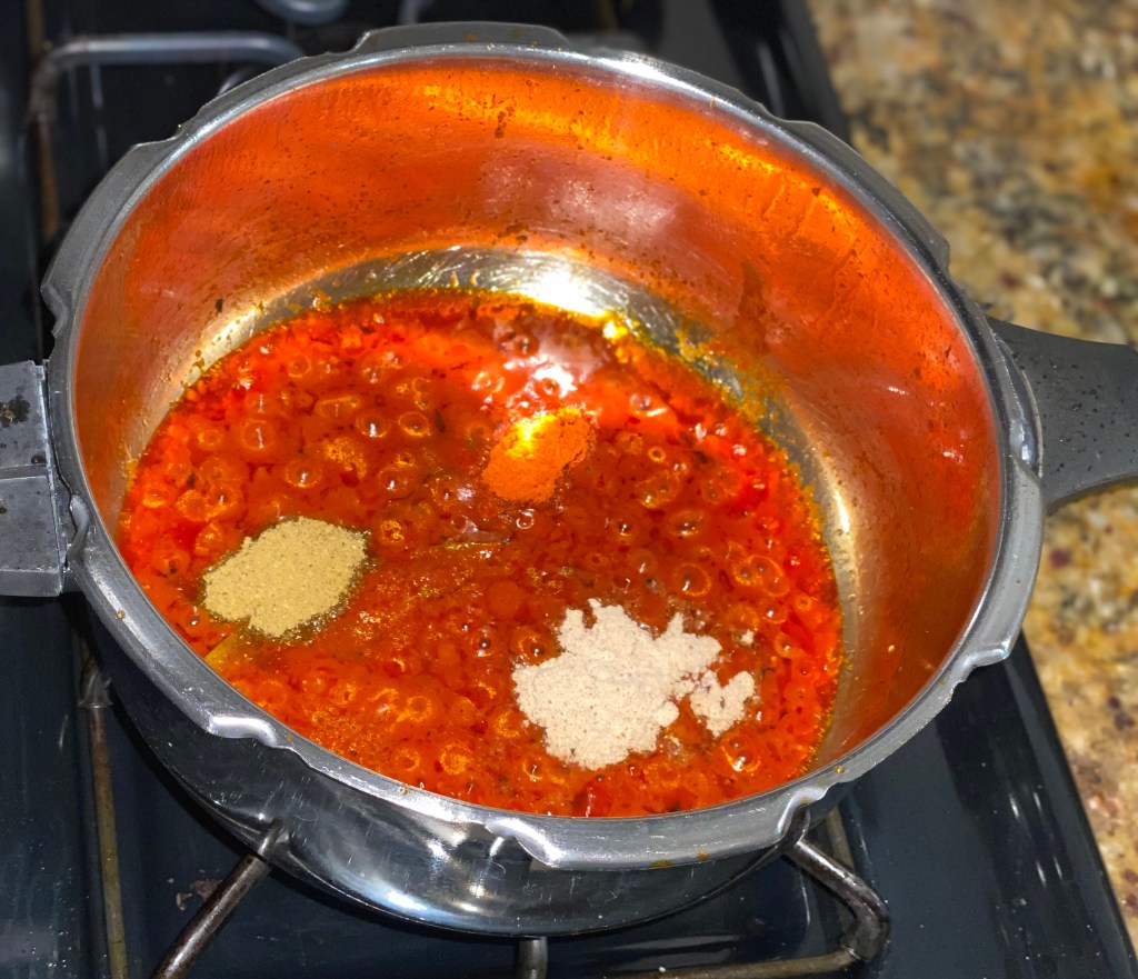 As the tomato puree cooks the oil starts separating, now add the powdered spices (amchoor powder, chole Masala, turmeric powder, chilli powder) and let it cook for 2 minutes.