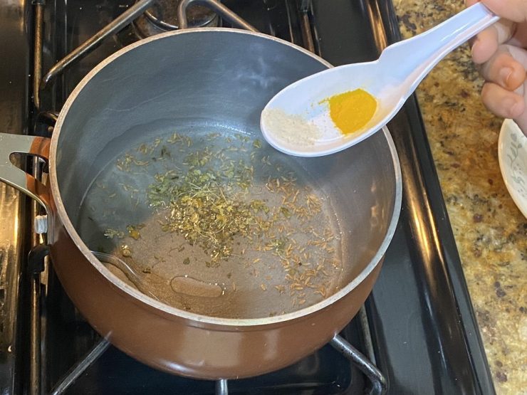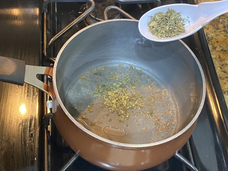 After the cumin seeds start to splatter, crush the kasuri methi leaves and add them.