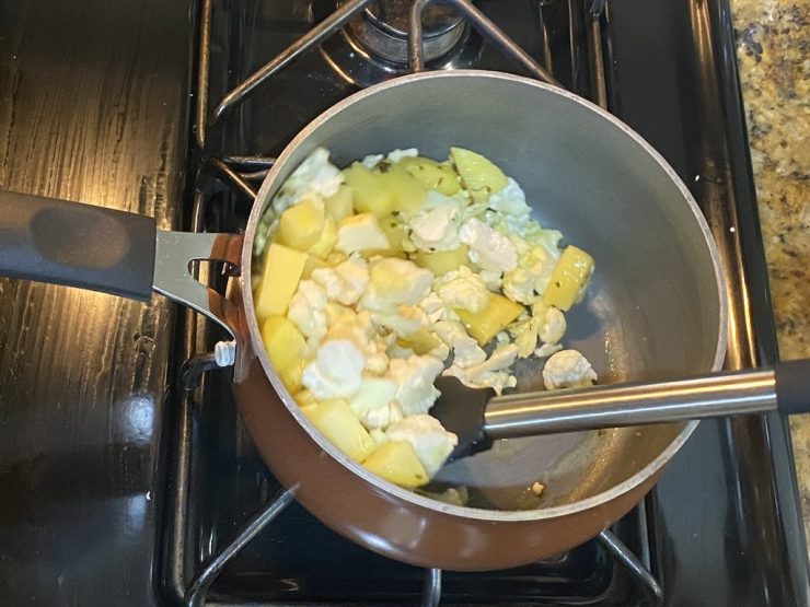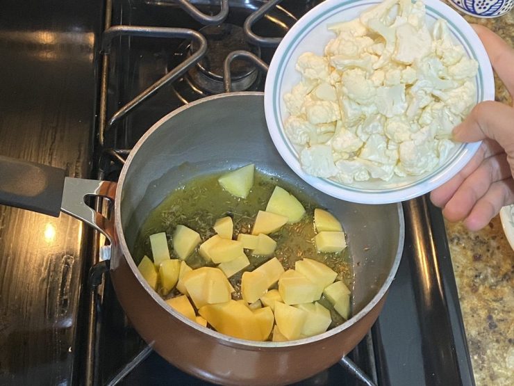 Add aloo and cauliflower and stir.