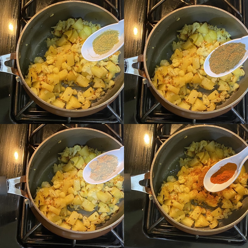 After the aloo is cooked, add the dry spices: coriander powder, red chilli powder, aamchoor powder and garam masala. Mix well.Ā