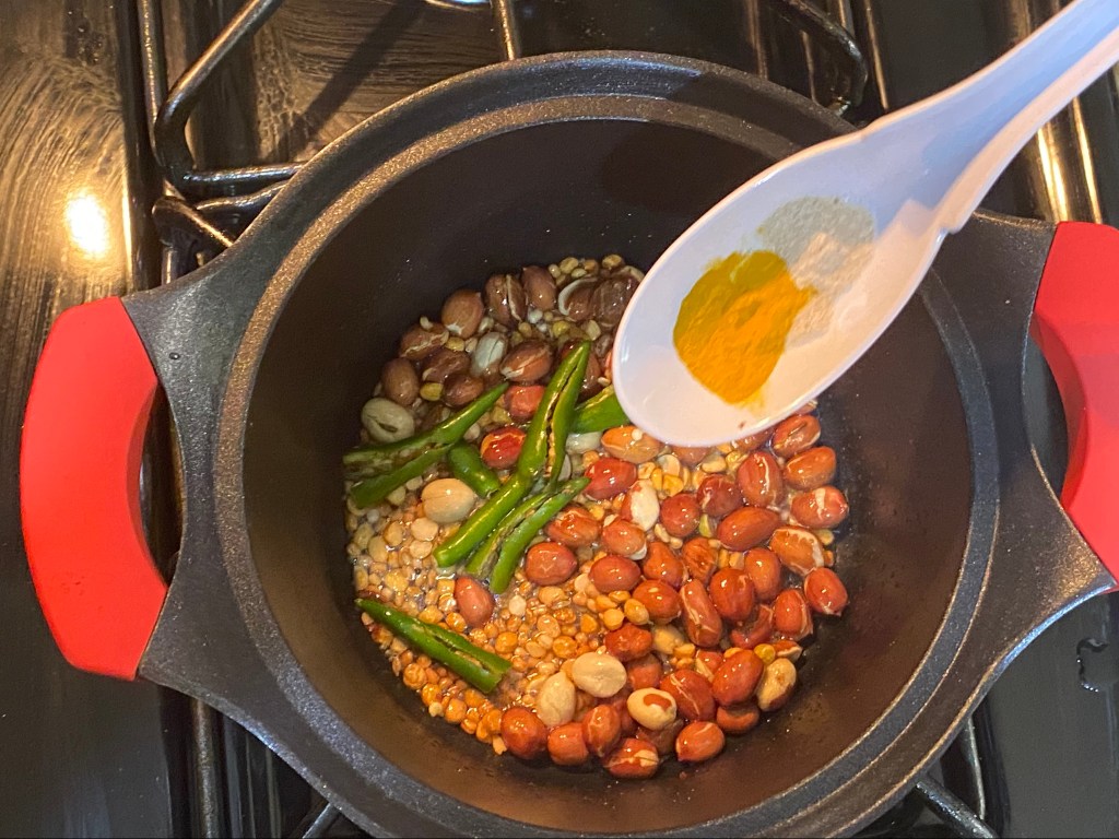 As the peanuts get roasted, add channa dal and urad dal.