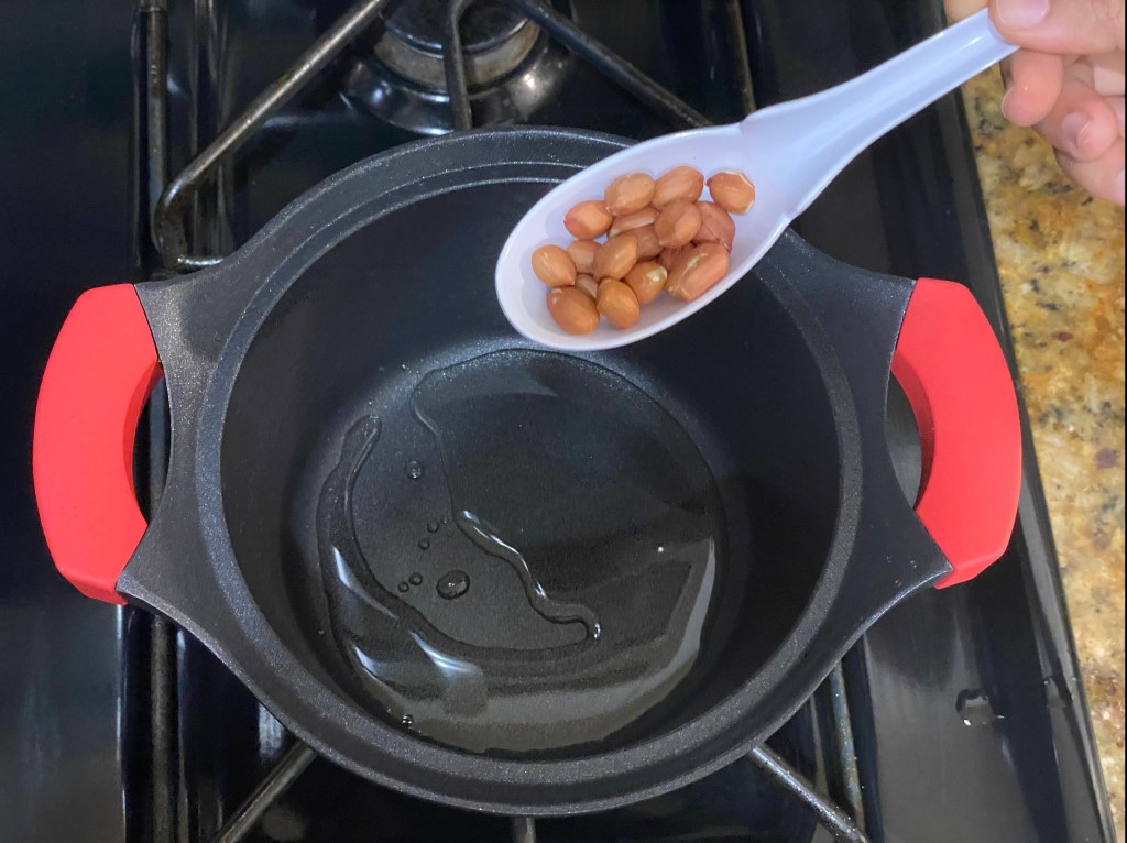 As the oil heats up, add peanuts.