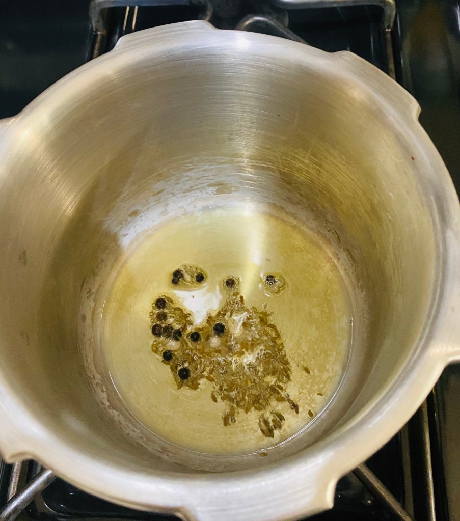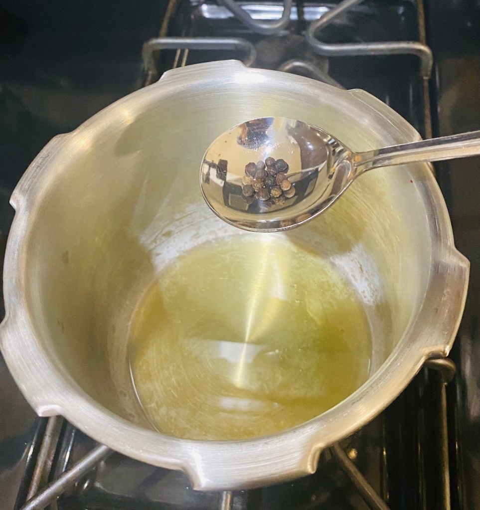 As the Ghee melts, add pepper and 1/2 tsp cumin.