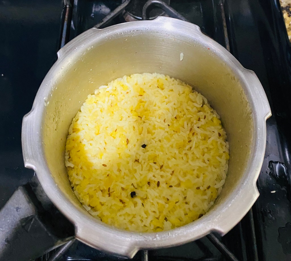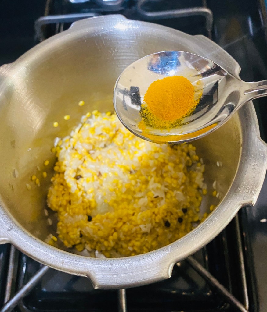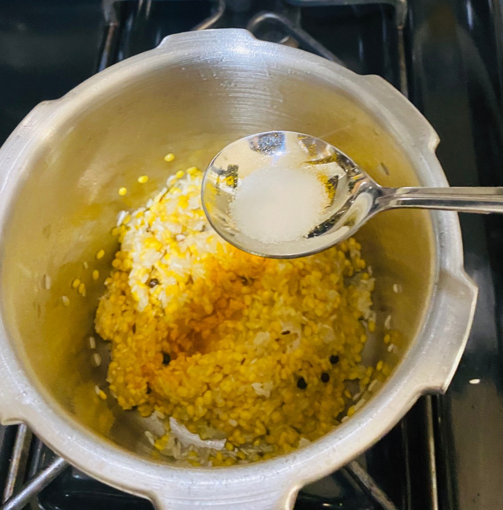 Saute the dal and rice till they turn aromatic , then add 3 cups of water ( extra cup of water for consistency) . Add Salt to taste and pinch of turmeric and allow it to cook for 4 whistles.