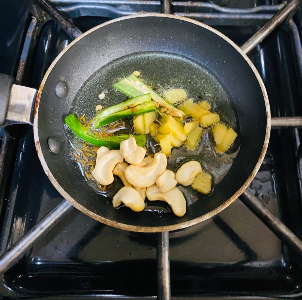 As the ghee melts, add 1/2 tsp cumin, ½ tsp crushed pepper, 1 inch ginger, 2 slit chilli, 10 cashew and pinch of hing.