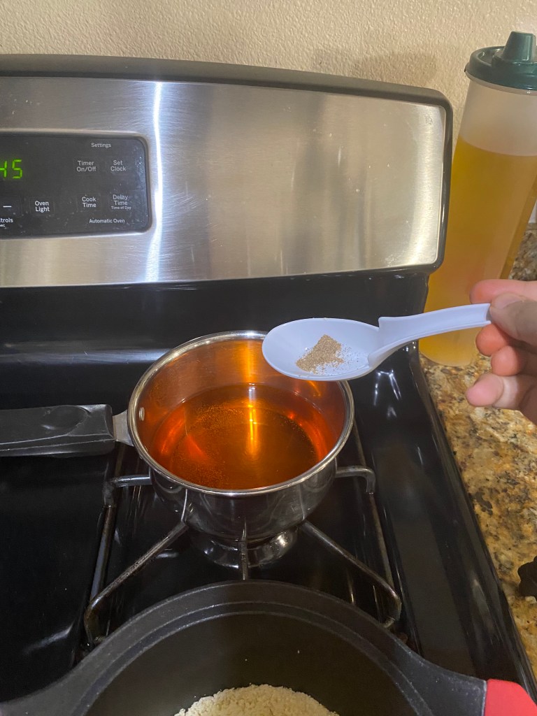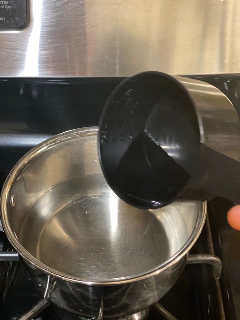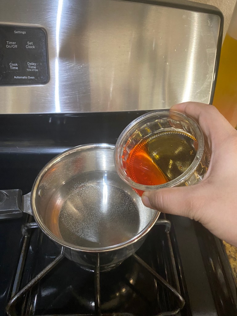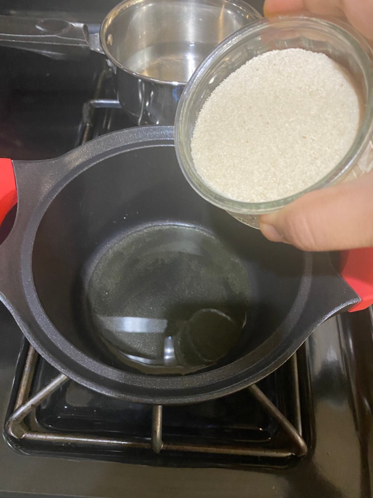 Now , you see the water in the other pan is boiling . Now add the food color dilutes in 1tbsp water to it .