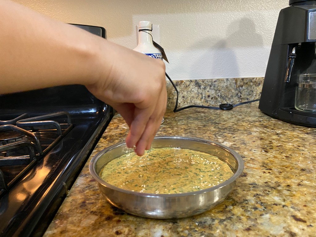 Now transfer the batter into the steaming plate.Now sprinkle some more sesame seeds on the top.