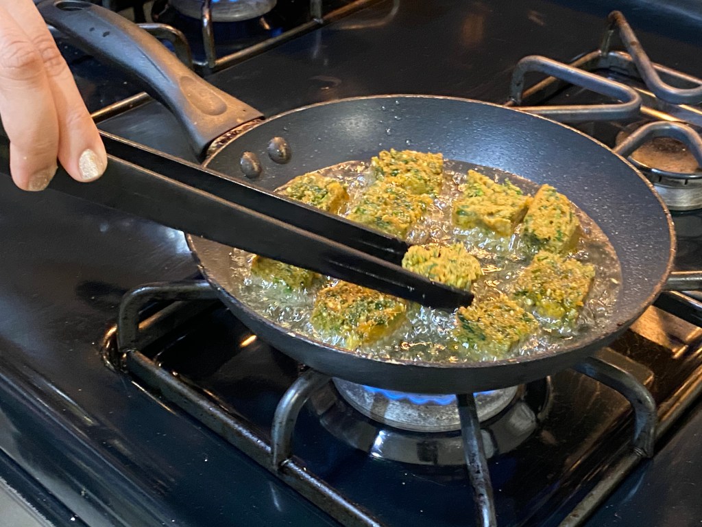 Now take a pan and add oil. As the oil heats add the vadi squares and fry them.